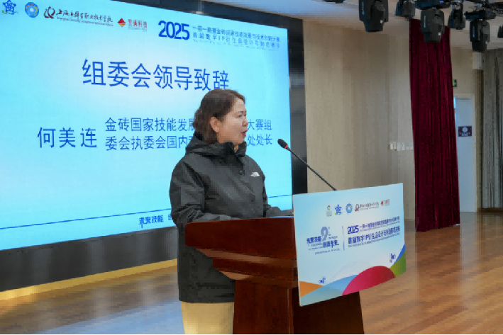 金砖国家技能发展与技术创新大赛组委会执委会国内竞赛办公室二处处长何美连代表大赛组委会致辞。她对全体参赛师生、赛事筹备人员及专家评委致以热烈欢迎和诚挚感谢,并代表组委会郑重承诺,将高标准组织赛事,严守公平公正原则,营造规范有序的竞赛环境。