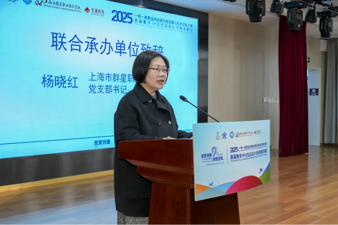 上海市群星职业技术学校党支部书记、校长杨晓红代表承办校致辞。她表示,数字IP衍生品作为文化价值与产业动能相结合的重要载体,承载着文化传承、技术创新与市场扩展的多重使命。一带一路倡议与金砖国家的合作机制为技能交流与技术创新搭建了更广阔的舞台。作为本次大赛的承办单位,学校将以专业高效的服务确保赛事公平、公正、公开举办。预祝各位选手在比赛中取得优异成绩。