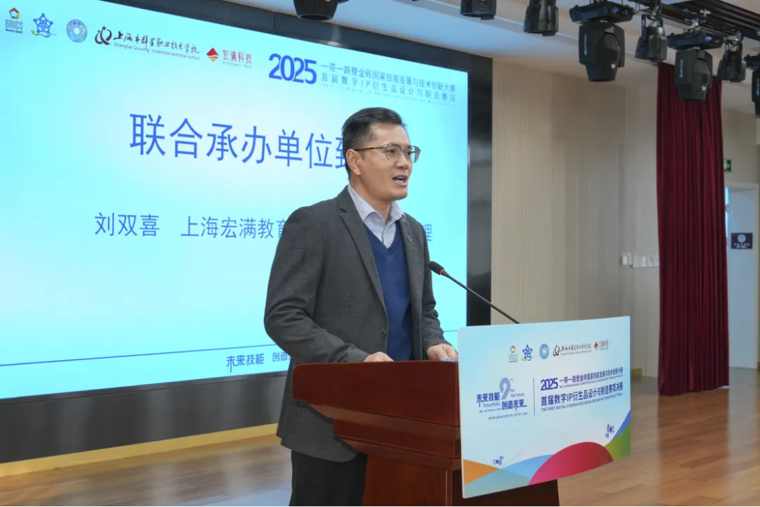 上海宏满教育科技有限公司总经理刘双喜致辞。作为大赛的联合承办方,宏满科技不仅全程保障赛项顺利进行,更联动自身产业资源,将行业前沿实践融入赛项全流程。本次赛事聚焦数字IP衍生品设计与制造,精准契合数字经济时代下文创产业的发展需求,与企业对复合型技能人才的需求高度契合。未来,宏满科技将持续深化与院校、企业的多方合作,推动赛事成果转化,为优秀选手开辟职业发展通道,助力数字文创产业创新升级。