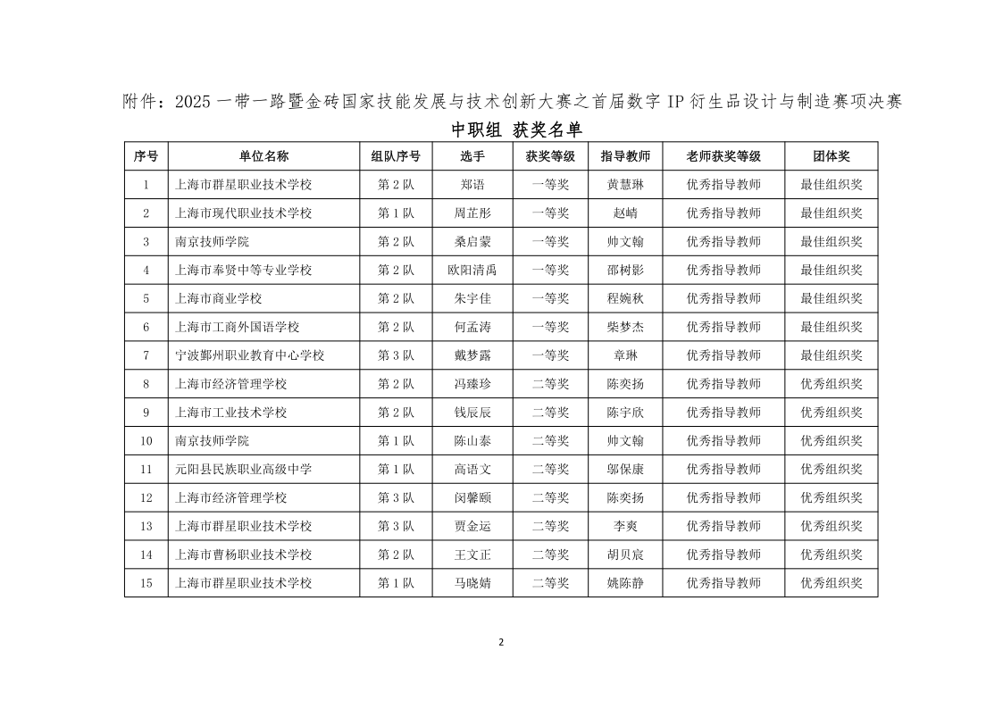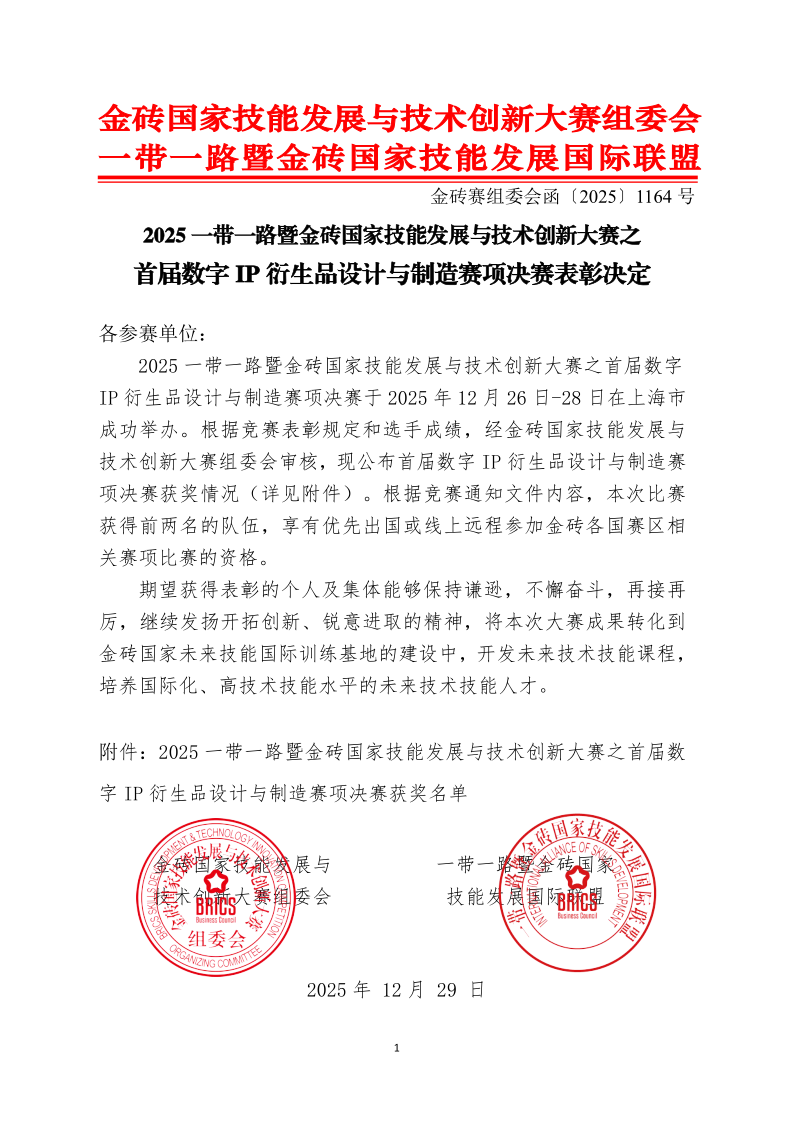 2025一带一路暨金砖国家技能发展与技术创新大赛首届数字IP衍生品设计与制造赛项决赛于2025年12月26日-28日在上海市成功举办。根据竞赛表彰规定和选手成绩,经金砖国家技能发展与技术创新大赛组委会审核,现公布首届数字IP衍生品设计与制造赛项决赛获奖情况。
